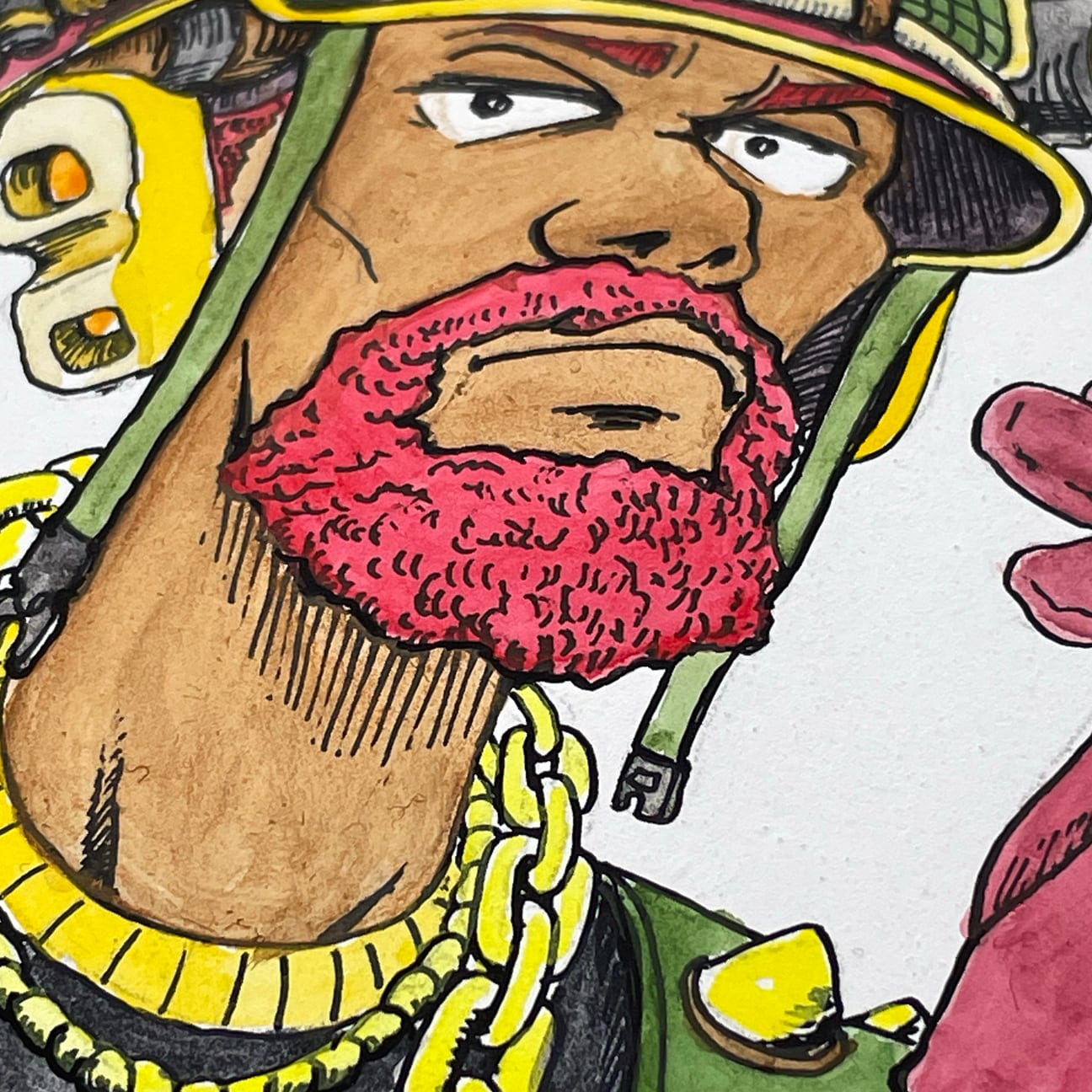 新時代のレゲエキャラクターを自由にイメージして描きました。原画と同じ絵柄のアクリルキーホルダー(1つだけ作った非売品)が付いています。原画は外に持ち出すのが難しいので、このアクキーを身につけて「これの原画を持っている」と自慢してください(^^)