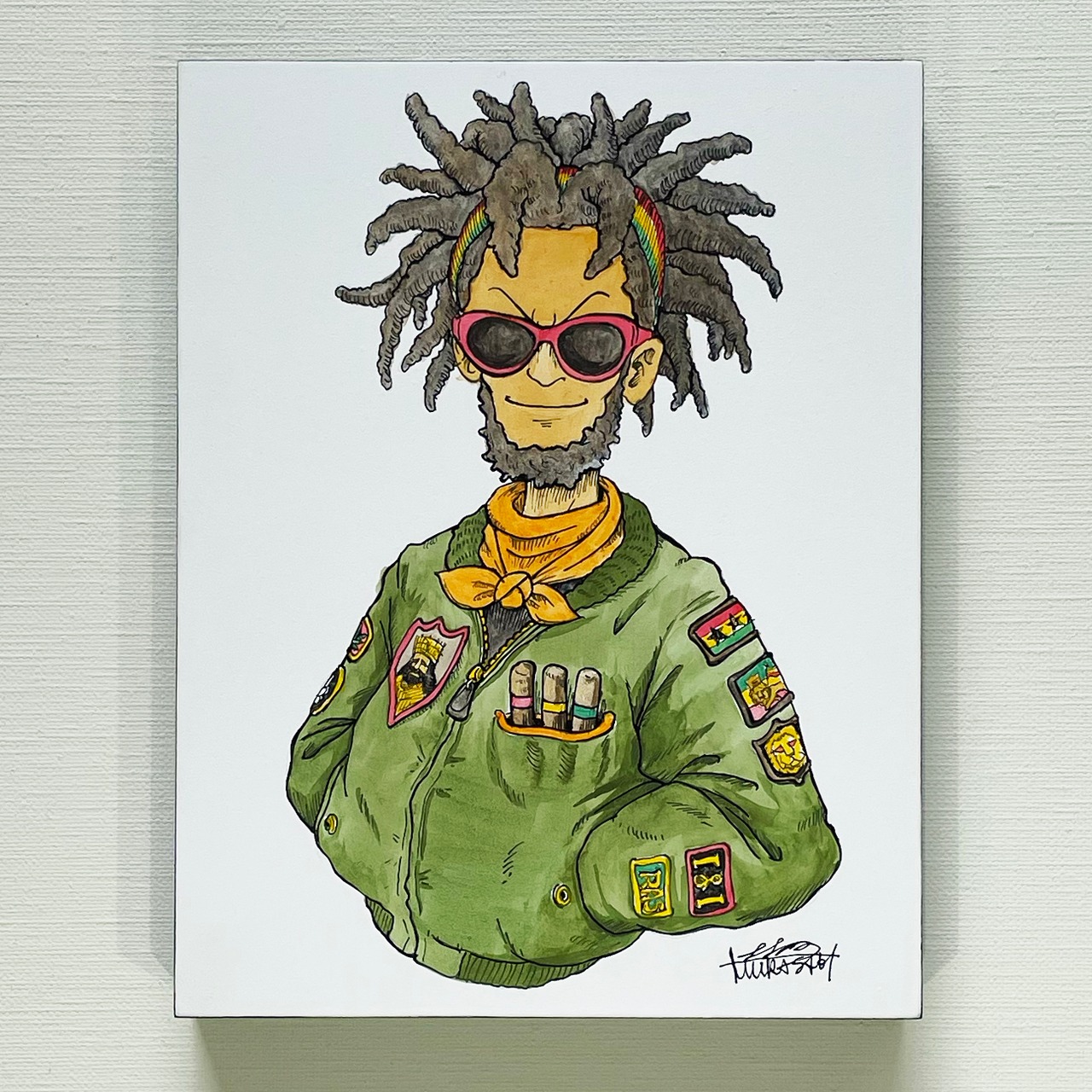 新時代のレゲエキャラクターを自由にイメージして描きました。原画と同じ絵柄のアクリルキーホルダー(1つだけ作った非売品)が付いています。原画は外に持ち出すのが難しいので、このアクキーを身につけて「これの原画を持っている」と自慢してください(^^)