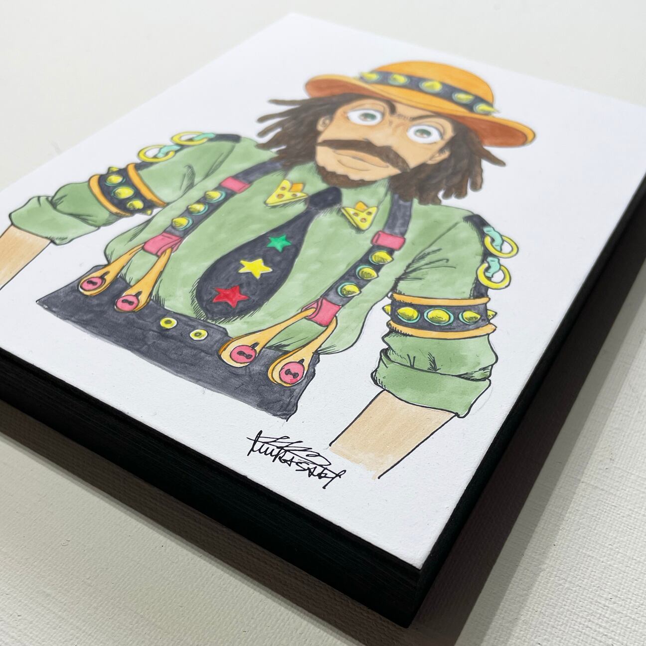 新時代のレゲエキャラクターを自由にイメージして描きました。原画と同じ絵柄のアクリルキーホルダー(1つだけ作った非売品)が付いています。原画は外に持ち出すのが難しいので、このアクキーを身につけて「これの原画を持っている」と自慢してください(^^)