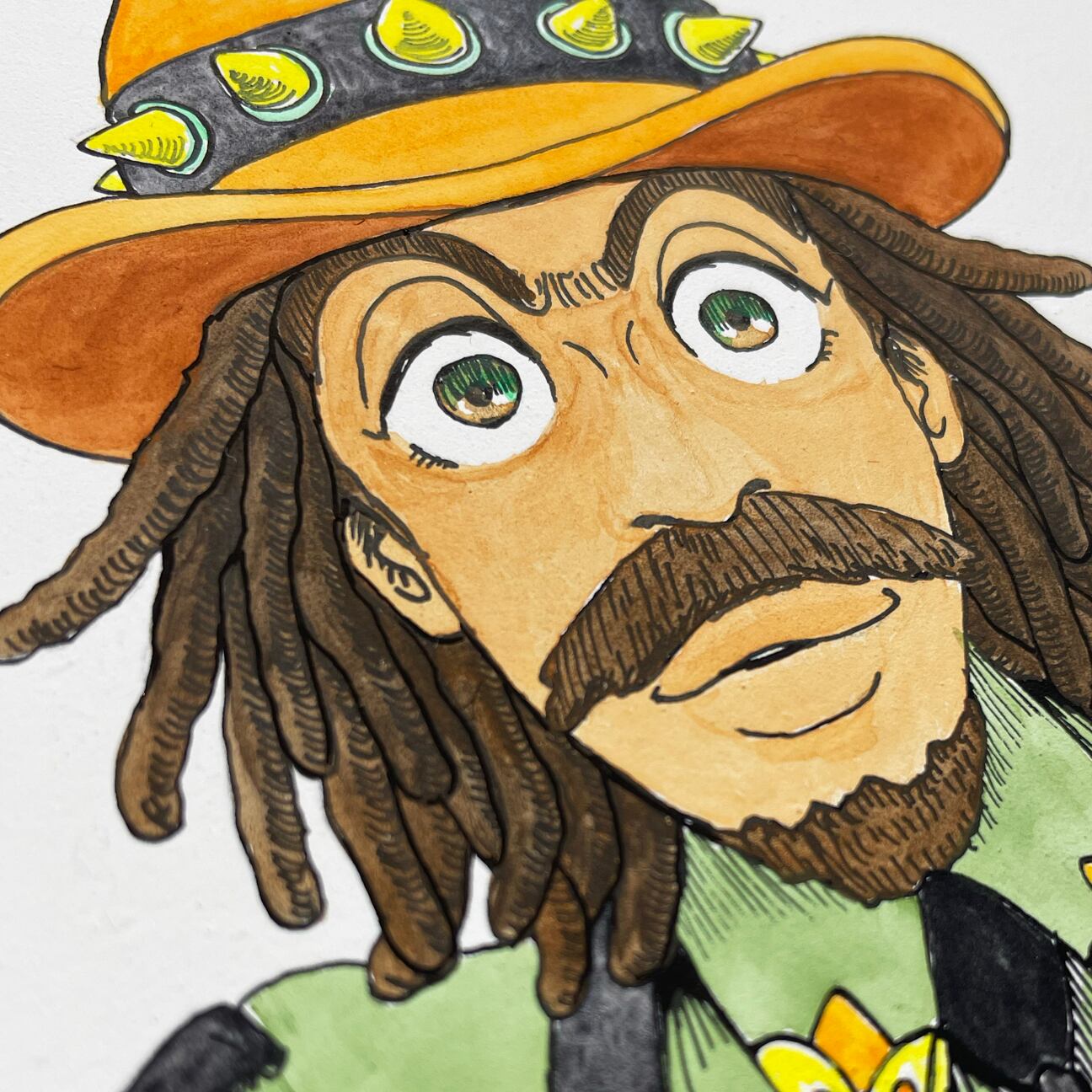 ダンスホールキングBEENIE MANをモデルにしました。この顔にモロ似(というかその写真にモロ寄せ)のポートレートがあります。ハットがクラシカルな形なので全体の雰囲気もチャールストンっぽくした上で、コミカルな大ぶりの鋲やリングを着けました。