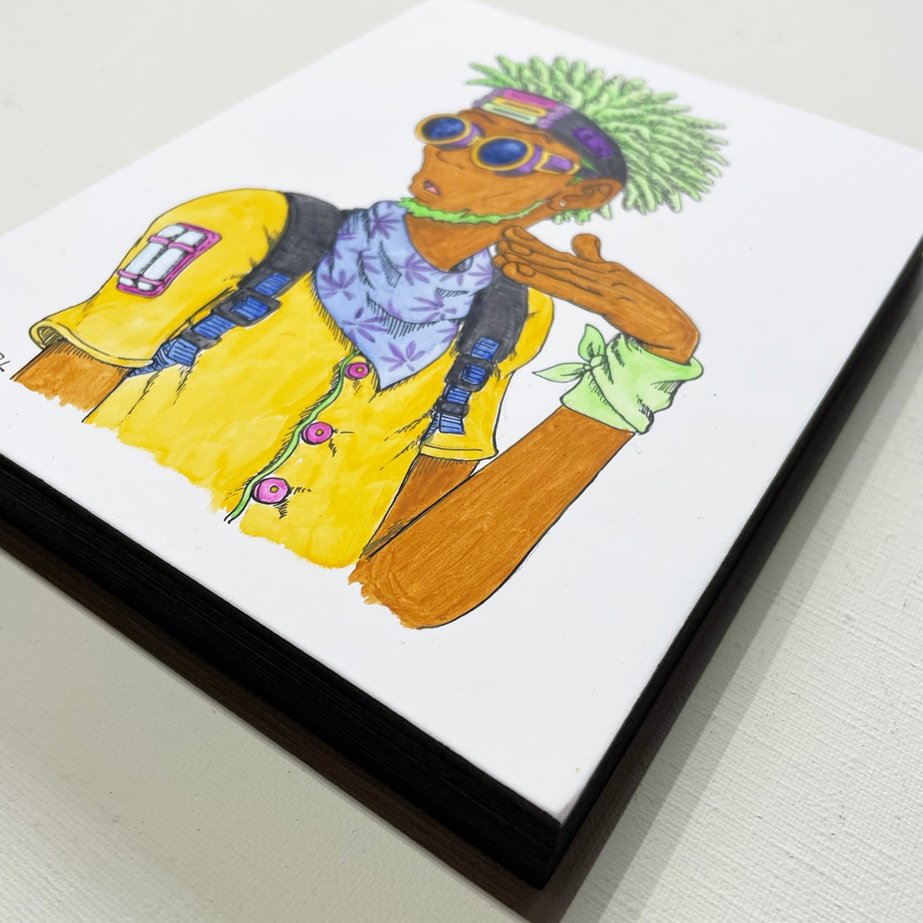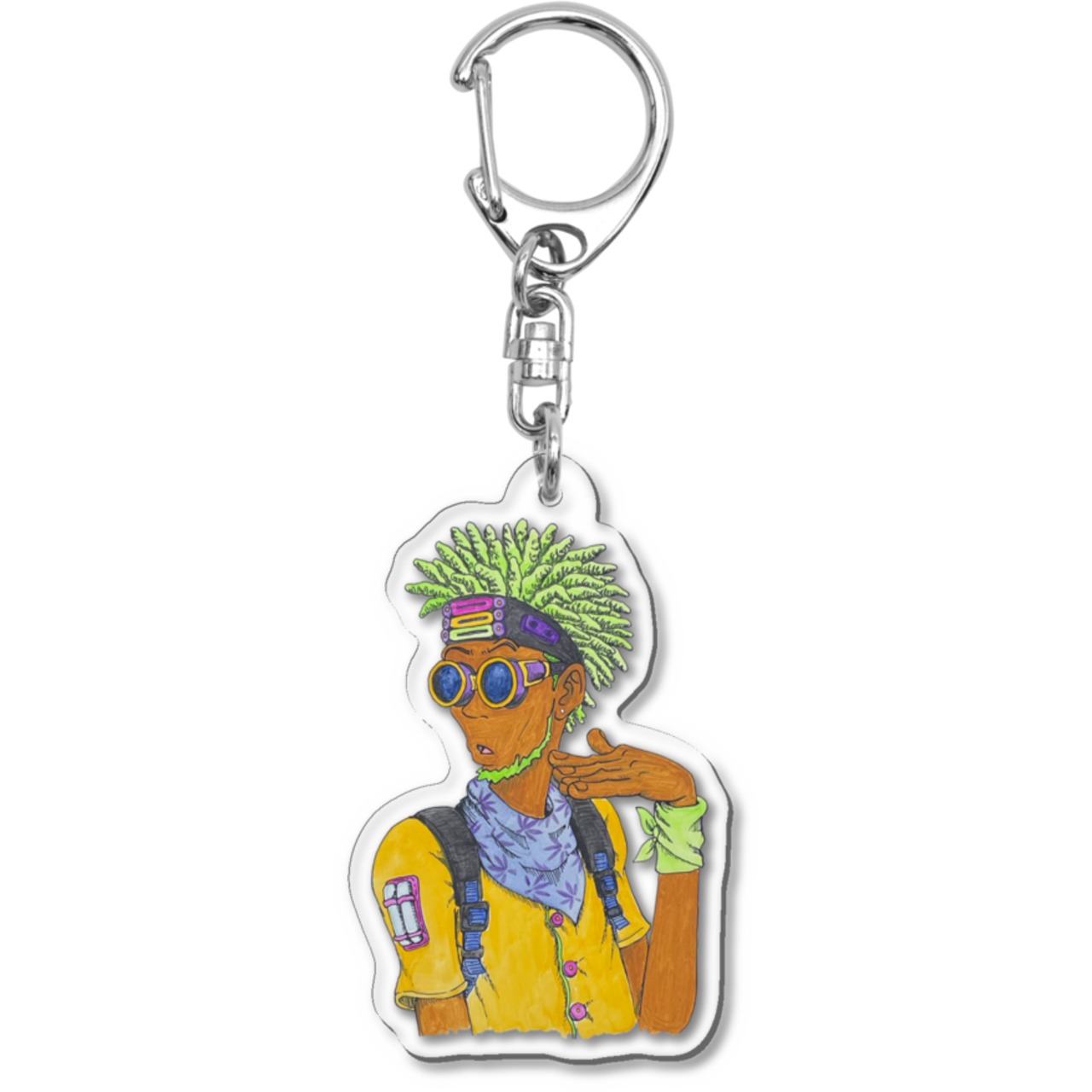 新時代のレゲエキャラクターを自由にイメージして描きました。原画と同じ絵柄のアクリルキーホルダー(1つだけ作った非売品)が付いています。原画は外に持ち出すのが難しいので、このアクキーを身につけて「これの原画を持っている」と自慢してください(^^)