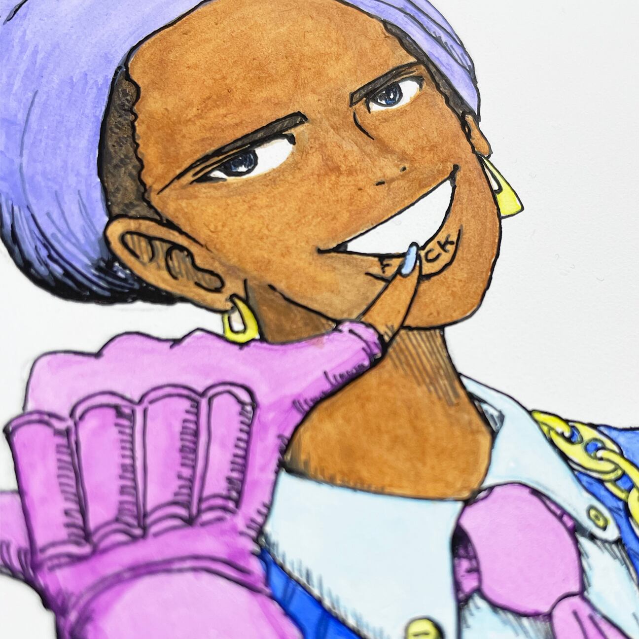 エチオピアン・クロスを下げたターバン姿は、一見すると敬虔なラスタファリアン女子に見えますが、ネックレスはオールドスクールテイストのグッチチェーンのゴールドで、唇の裏には「Fワード」のタトゥー。元々ヤンチャだった女の子がラスタに目覚めたという設定のキャラです。