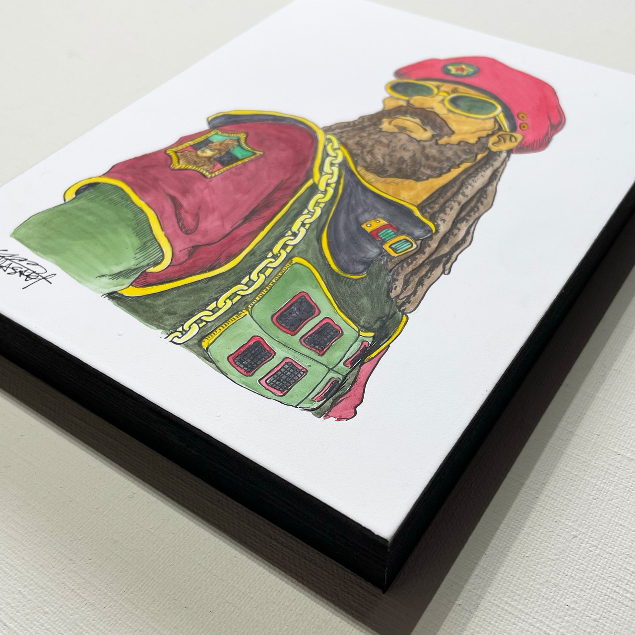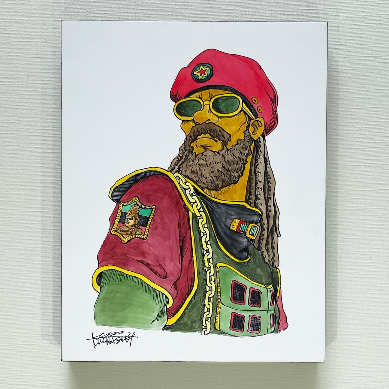 描き進めていく途中からPROTOJEのイメージと重なってきたので、NEO RASTAムーブメントの旗手としても活躍する彼の志の高さを表現してみました。腕にはラスタファリアンはじめ、ブラックパワームーブメントに影響を与えた偉人マーカスガーベイのワッペンが付いています。