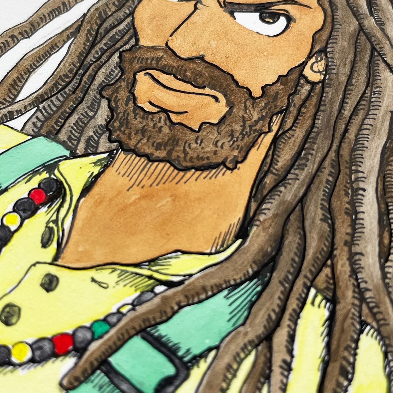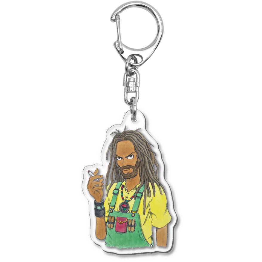新時代のレゲエキャラクターを自由にイメージして描きました。原画と同じ絵柄のアクリルキーホルダー(1つだけ作った非売品)が付いています。原画は外に持ち出すのが難しいので、このアクキーを身につけて「これの原画を持っている」と自慢してください(^^)
