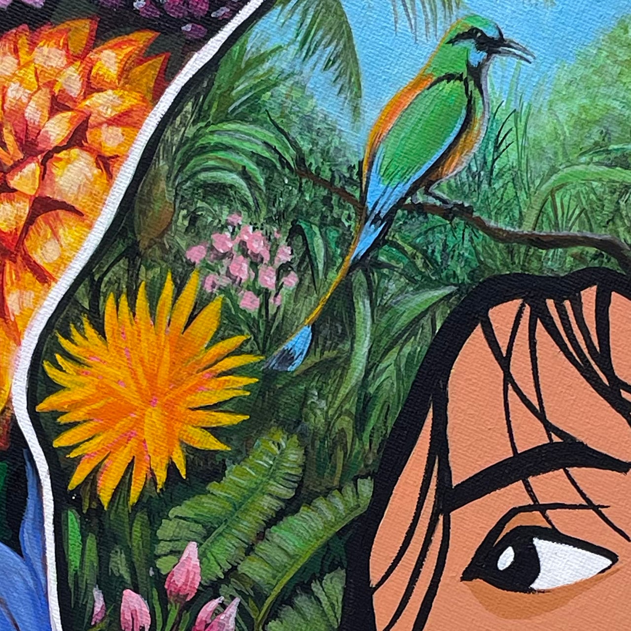 色とりどりの花に囲まれたヘッドラップ着用の女の子のキャラはRIHANNAのポートレートがモチーフ。リアルタッチで描いた花の中にフラットなアニメ塗りのキャラをレイアウトすることで存在感を際立たせました。また、ヘッドラップの柄的に描いた風景もリアルタッチにすることで、より現実離れした不思議な世界観となるように仕上げました。